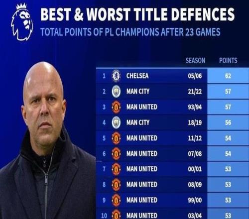 德国转会市场网站列出了英超历史上卫冕冠军在赛季前23场比赛过后的积分排行,本赛季的利物浦以36分排名倒数第...
