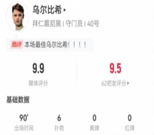 体育播报1月29日宣 拜仁在本轮欧冠2-1力克埃因霍温,小将乌尔比希本场数据如下:首发踢满全场6次扑救、4次扑救...
