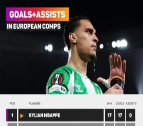 安东尼加盟贝蒂斯后在欧战参与14球,同期仅姆巴佩参与进球比他多