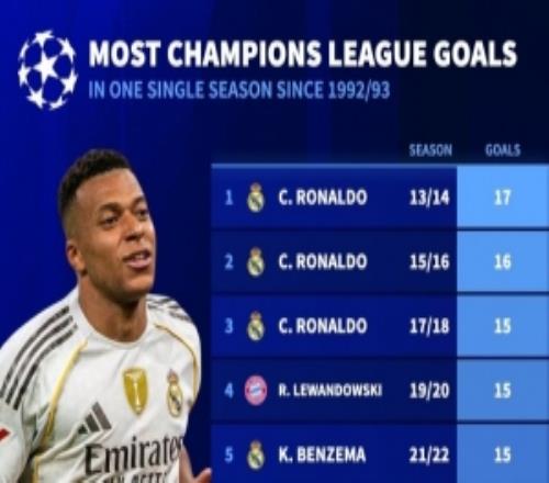 欧冠改制以来单赛季进球榜:C罗17球居首,本赛季姆巴佩13球上榜