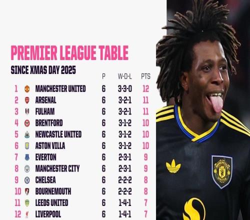 据足球数据网站Opta统计,自圣诞节以来没有任何英超球队的胜率超过50%,曼联拿到12分,是同期拿分最多的球队。圣...