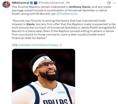 根据NBA记者马克-斯坦恩的说法猛龙、老鹰等是对浓眉有意的球队,猛龙与独行侠的交易谈判涉及奎克利、巴雷特、珀尔特尔,独行侠对这些交易筹码并不感冒,他们认为就算加入一些未来的首轮签对球队的未来也没有太大的经济效益,因为这些人的合同都较长。