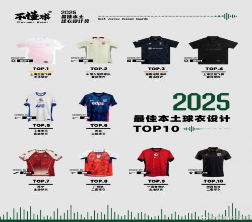 不懂球正式发布2025最佳本土球衣设计奖,由51名业内人士组成的评审团,最终经过投票评选出2025最佳本土球衣设计TOP10。最终排名如下: