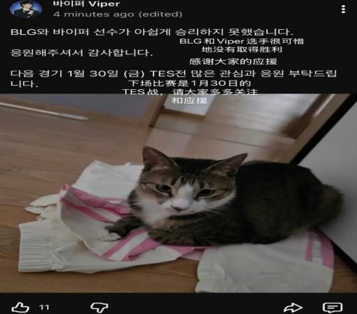 啥情况网友讨论Viper韩国社媒运营赛后发图不妥其宠物猫把BLG队服踩在脚下