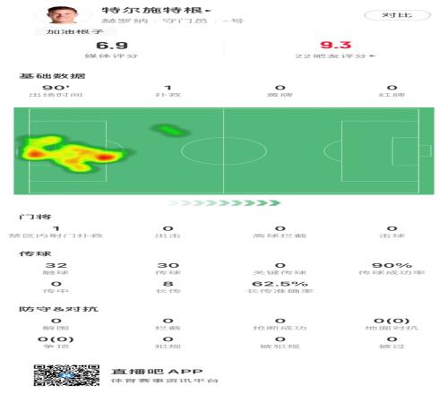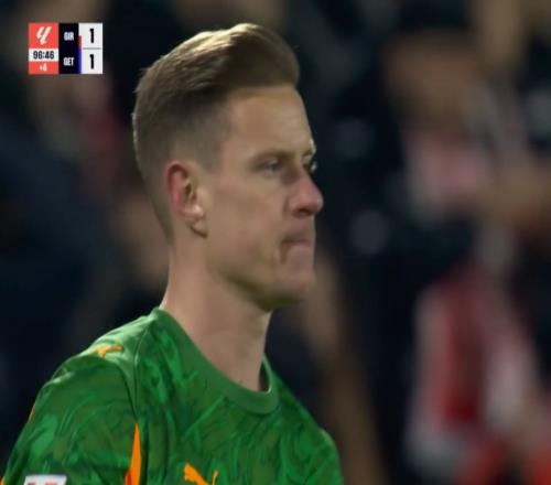 比赛的最后时刻,赫罗纳禁区内出现险情,特尔施特根近距离将球扑住,力保球队不被绝杀。