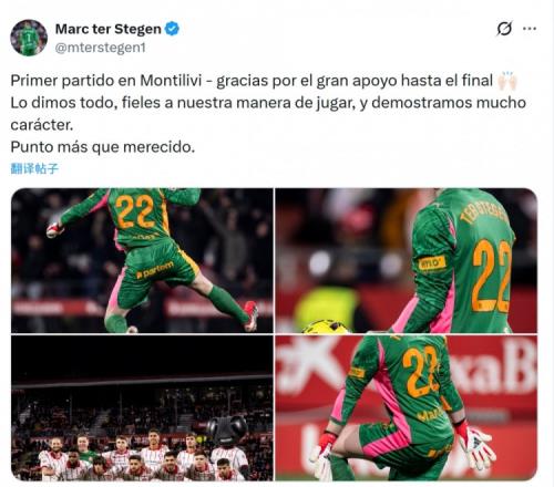 特尔施特根社媒晒出比赛照片,并写道:“我在蒙蒂利维的首场比赛,感谢大家一直到最后的全力支持。”
