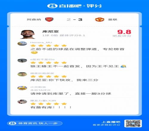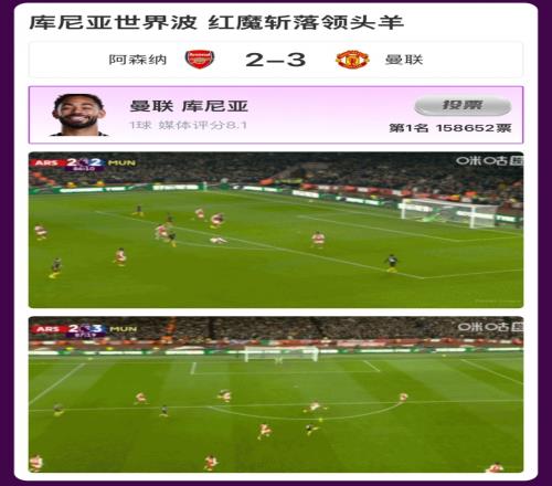 本轮焦点战曼联客场3-2力克领头羊阿森纳,替补登场的库尼亚轰出世界波,在阿森纳扳平3分钟后再次将比分超出,并保持到了完场。