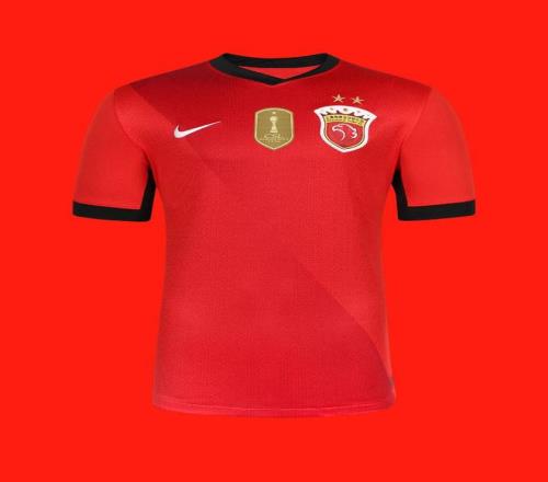 上海海港的新款主场球衣依以红色作为主色调,领子下方增加一枚金色盾牌。这个特别配饰是冠军队伍的象征,赞助商首次使用这种类型的设计。金色的盾牌中间有一个以中超冠军奖杯——火神杯为设计灵感的徽章,下面标有夺冠年份,这是中超“冠军配置”球衣。