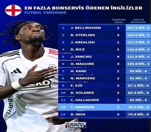 北京时间1月28日,在亚伯拉罕转会至阿斯顿维拉正式重返英超之后,德转统计出了英格兰球员累计转会费TOP13,贝林厄姆1.571亿欧元高居第1,亚伯拉罕则以7850万欧元排名第12位。