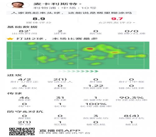 体育播报1月29日宣 在本轮欧冠,利物浦6-0击败卡拉巴赫,以下为麦卡利斯特本场数据: