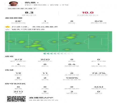 体育播报1月29日宣 拜仁在本轮欧冠2-1力克埃因霍温,凯恩本场数据如下: