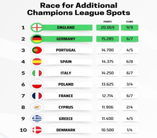 体育播报1月29日宣 欧冠联赛阶段赛场结束,以下为本赛季目前各联赛欧战系数(前2名获额外欧冠名额):
