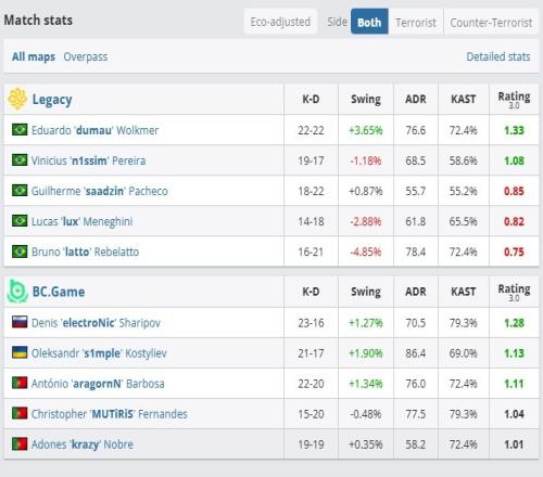 图一是BC选择的Overpass,上半场s1mple双杀赢得手枪局,但随即在长管三葡萄牙哥们白给惨遭翻盘,而后saadzin一把鸟狙两个爆头,BC.GAME连续3局输掉残局之后毫无进攻手感,Legacy以一波10-1铁血防守结束半场。换边Legacy拿下手枪局之后也被BC.GAME翻盘,逆境局势下s1mple手感火热两局7杀,电子哥绕后放人3杀,BC.GAME防守端越打手感越好,一度在防守方连下10局先拿赛点,虽然Legacy将比赛追入加时,但加时赛电子哥AK+刀杀拿下三杀,BC.GAME防守全取3分,最终完成逆转赢下自选图!