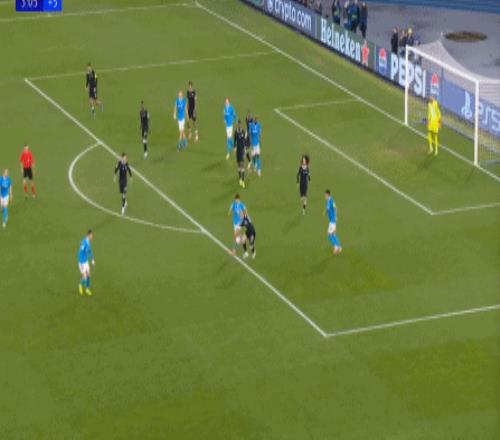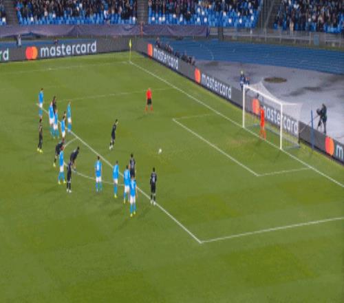 但在这次任意球的主罚过程中,那不勒斯送上了手球犯规,于是任意球直接变成了点球: