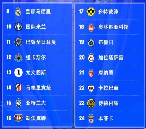 附加赛区包括了皇马、国米、巴黎、纽卡、尤文、马竞、亚特兰大、勒沃库森这八支实力不俗的种子球队,及多特蒙德、奥林匹亚科斯、布鲁日、加拉塔萨雷、摩纳哥、卡拉巴赫、博德闪耀、本菲卡这八支不是种子却实力不俗的球队。接下来会靠专门给到的抽签来决定对阵顺序,胜者晋级淘汰赛。