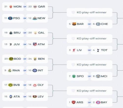 北京时间1月29日,欧冠联赛阶段结束了全部比赛的角逐。至此,欧冠淘汰赛的四大分区也正式落位完成。被本菲卡踢进附加赛的皇马将与曼城同区,巴萨、切尔西则将与大巴黎同区。