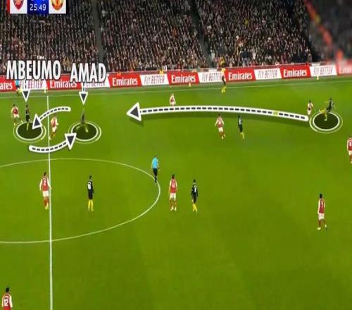 姆贝莫、阿马德和B费在右路,也踢得非常高效。B费牵制了阿森纳中卫萨利巴,但阿马德和姆贝莫因此得到了在威胁区域接球的机会。因此,当曼联进攻时,阿森纳的防守陷入了真正的混乱。苏比门迪的乌龙助攻,就是阿森纳被逼进他们不想进入的领域的结果。