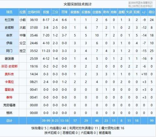 火箭:阿门25分7板4助3断、杜兰特24分2板6助、申京18分10板7助2断、伊森10分6板3断、谢泼德9分5板2帽、史密斯8分7板2助、卡佩拉5分4板2帽、奥科吉3板3助