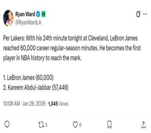 需要关注的是,詹姆斯在此役还创下了NBA历史第1的神迹。数据显示,加上此战的24分钟上场时间之后,詹姆斯职业生涯常规赛总出场时间达到6万分钟,他成为NBA历史上首位达到这一里程碑的球员。